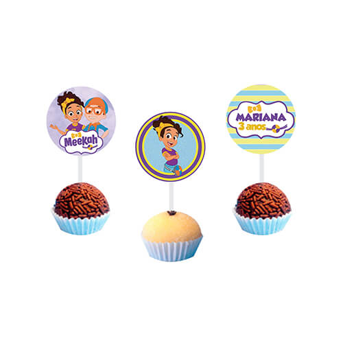 O Kit Personalizado Meekah Blippi contém 73 itens, incluindo um topo de bolo simples, três posters tamanho A4, quatro displays de mesa, mini caixas milk e pirâmide, além de 45 topos para docinhos. Opcionalmente, você pode adicionar uma bandeirola com até 12 caracteres. É fundamental deixar uma mensagem ao vendedor com o nome e idade do aniversariante ao finalizar a compra, pois a falta dessas informações pode atrasar o envio ou resultar em um topo padrão com a escrita “Parabéns”.